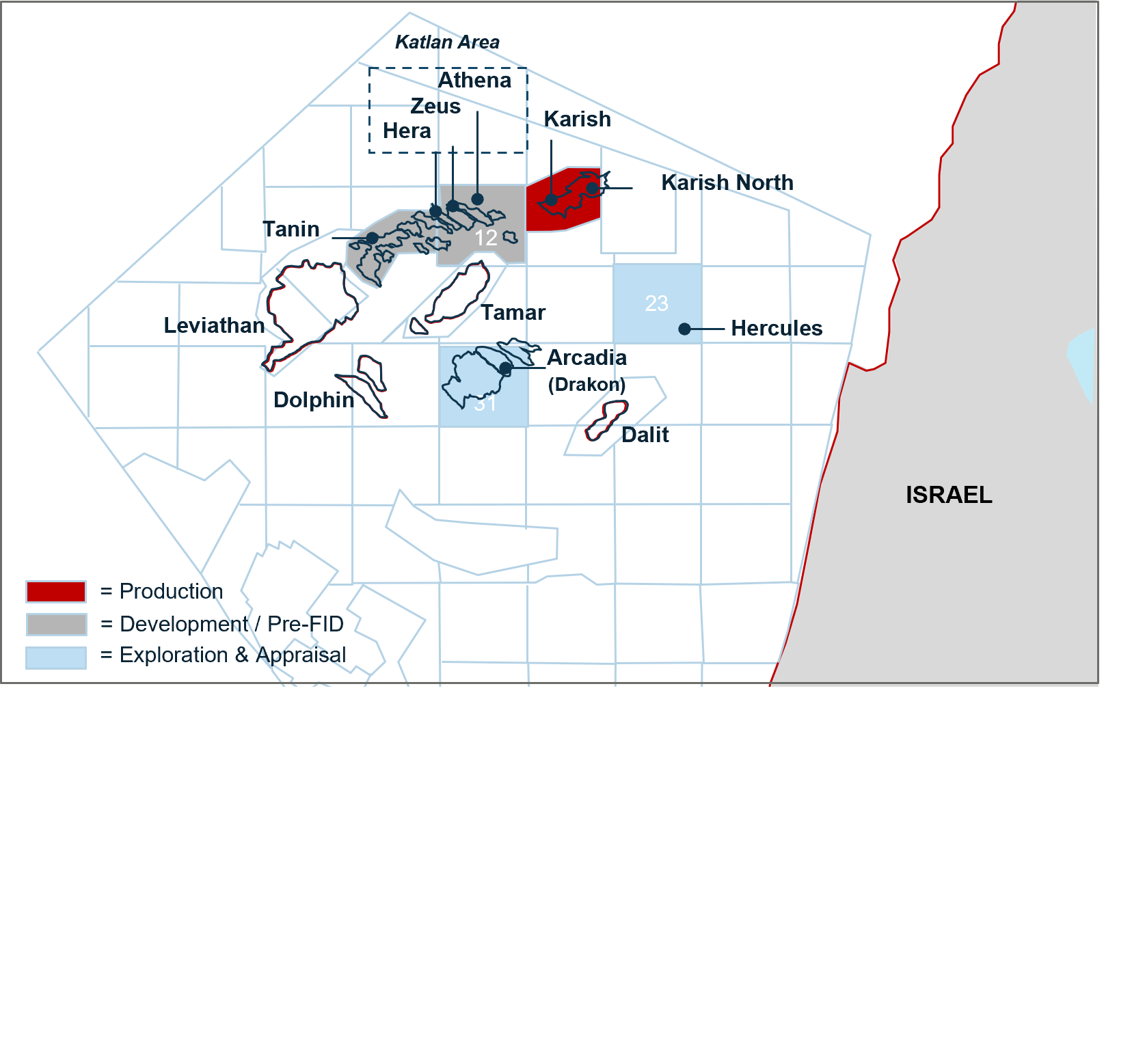 The Karish asset itself is a large two-way closure that sits on the southern upthrow side of a large down-to-the-north fault and is defined by 3D seismic data (2009 and 2010 Noble surveys). The Karish main field was evaluated by Noble in 2013 using a single discovery well (“Karish-1”) which was drilled by Noble to a depth of approximately 4,800m (true vertical depth subsea (“TVDSS”)). The discovered hydrocarbons within the Karish and Tanin Leases are contained with the Early Miocene submarine fan deposits of the Tamar Sands. Seismic data further suggests continuity of the main Miocene sands between the Leviathan, Tanin and Karish fields.